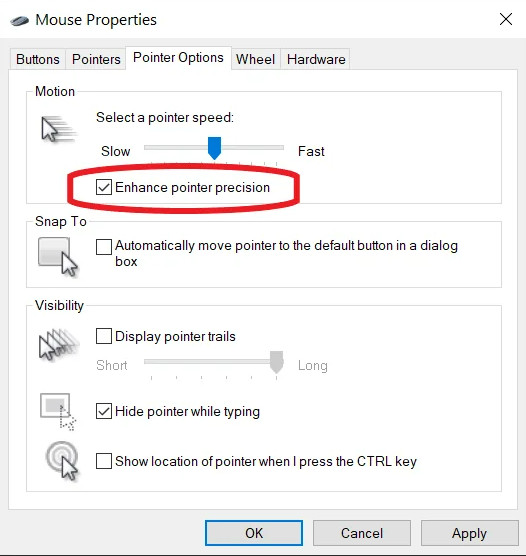 - Action: UNCHECK "Enhance pointer precision".